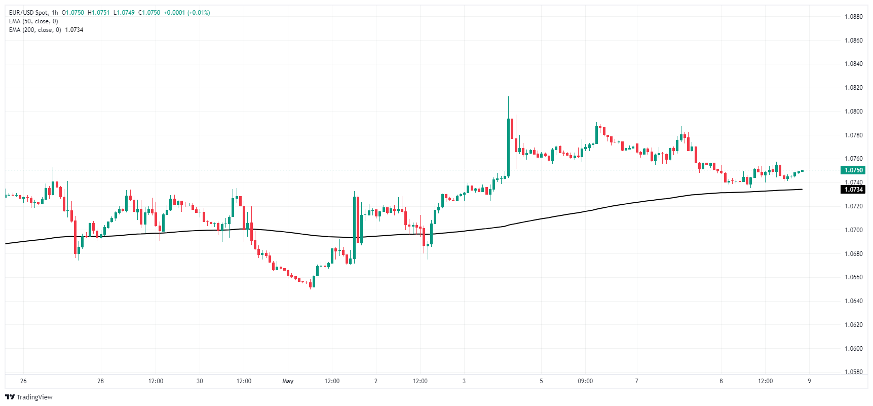 欧元兑美元继续震盪,接近中位数𧹒盘,向200小时指数移动均缐(EMA)1.0734靠拢。周三早盘,欧元兑美元𧹒盘稀少,盘中一度触及高位 1.0757 ,但随后看涨势头减弱,收盘于 1.0750 附近。