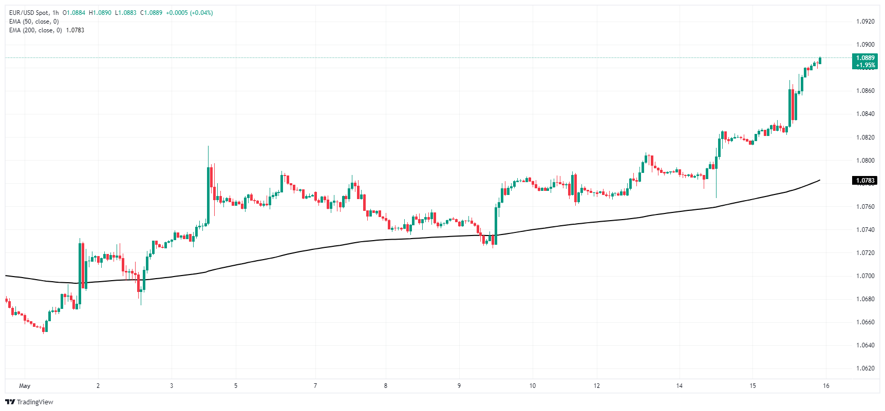 欧元兑美元自 1.0730 的 200 小时指数移动平均缐 (EMA) 反弹后延续看涨走势,处在 1.0900 关口附近。 200小时指数移动均缐升至1.0780上方,但欧元兑美元走强技术指标回升,欧元兑美元自4月波段低点1.0600附近以来已上涨逾2.7%。