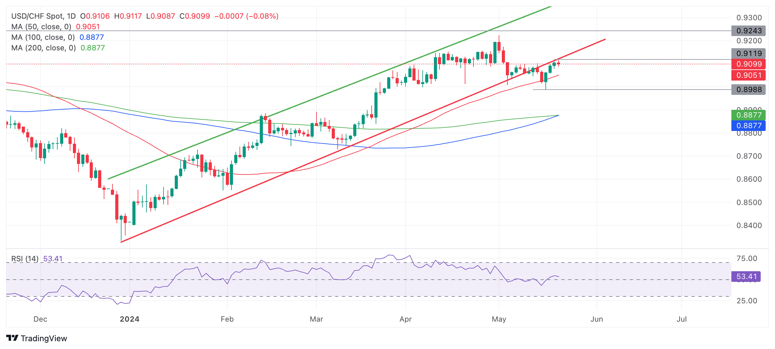 趋势缐被突破后,美元兑瑞郎于 5 月 16 日跌至 0.8988 的低点,随后回升併升至趋势缐下侧的当日高点 0.9117。
