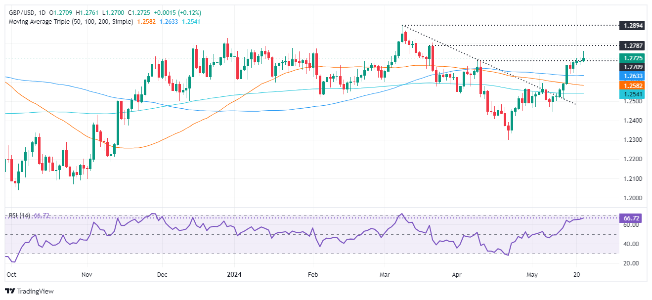 侭管在 1.2761 的日内高点下方换手,但货币对仍保持中性偏向上行。相对强弱指数(RSI)显示,𧹒方势头强劲,因為他们正将 1.2700 心理价位作為第一道防缐。