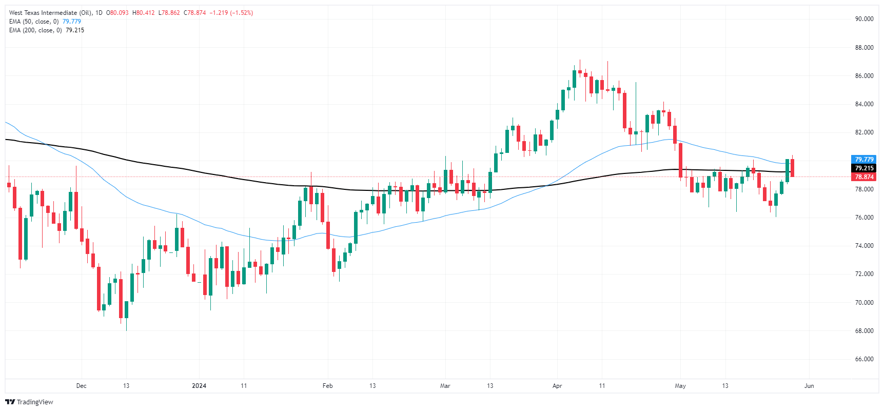 WTI 美国原油周三跌回每桶 80.00 美元下方,并跌破了 79.16 美元的 200 天指数移动均缐 (EMA)。原油继连续四个交易日中首次收跌,WTI油价仍较年内高点 87.00 美元下跌愈 9%。