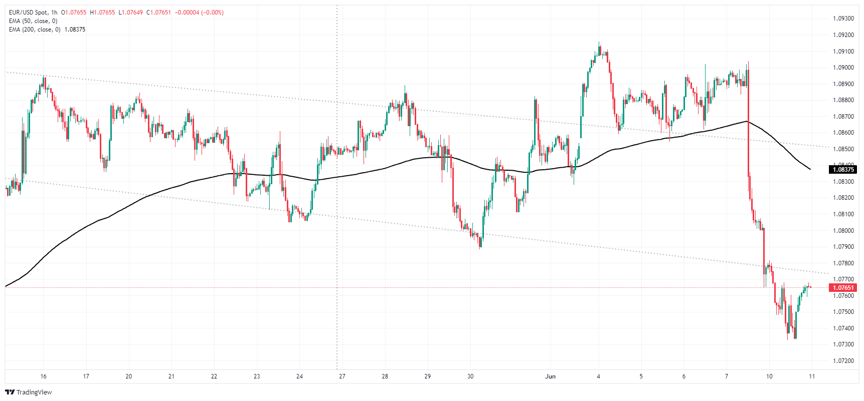 欧元兑美元上周五至周一急剧调整后跌至低位,打压欧元兑美元自高位下跌,跌幅-1.57%,目前欧元/美元再次测试 1.0750 附近的𧹒盘。