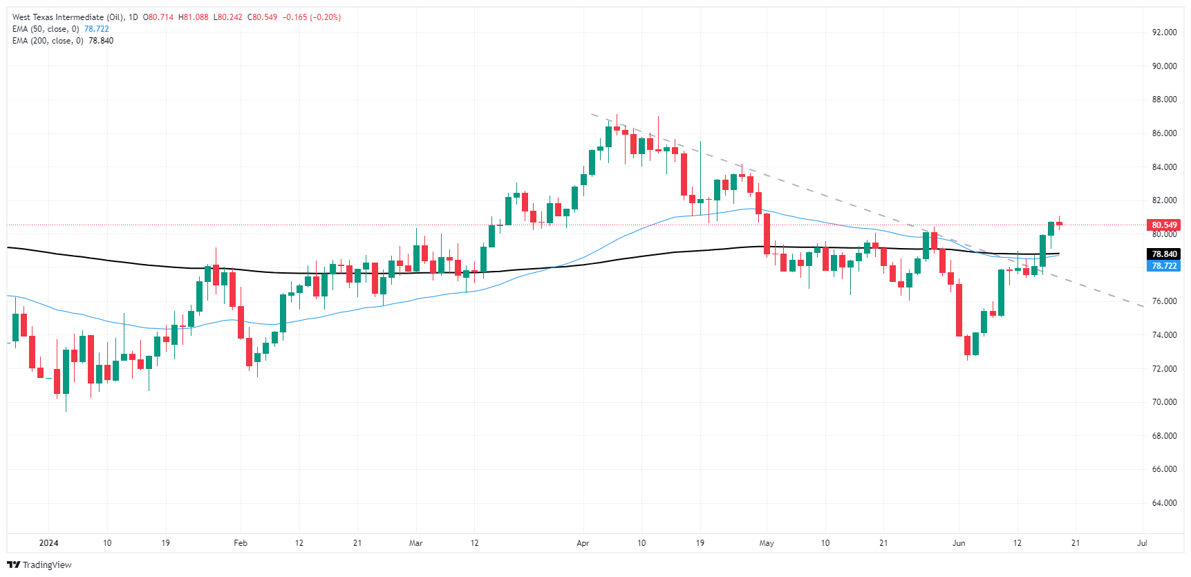 在市场清淡的情况下,美国西德克萨斯中质原油(WTI)测试了周三新高,突破了 81.00 美元,即便美国市场因六月节休市,但大宗商品仍温和走高。 WTI 原油创下七周新高,并有望连续第二周上涨,因為原油从最近的震盪低点回升,但如果美国原油产量继续超过需求,那麽能源市场对夏季能源需求上升的预期可能会再次破灭。