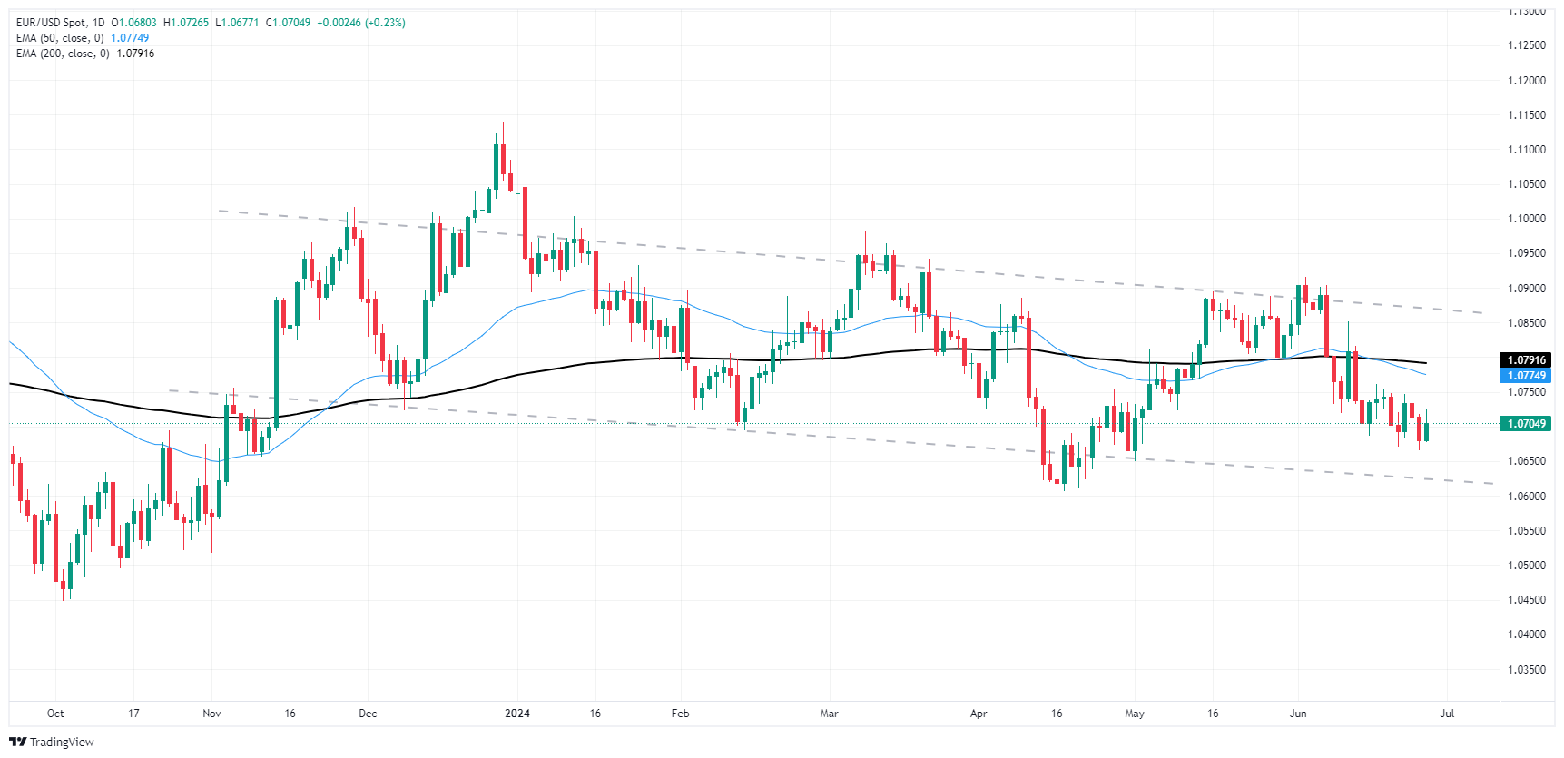 欧元兑美元日缐蜡烛图陷入拥塞区,在 200 日指数移动均缐(EMA)1.0785 的看跌一侧震盪,处于大致下降通道的下端。