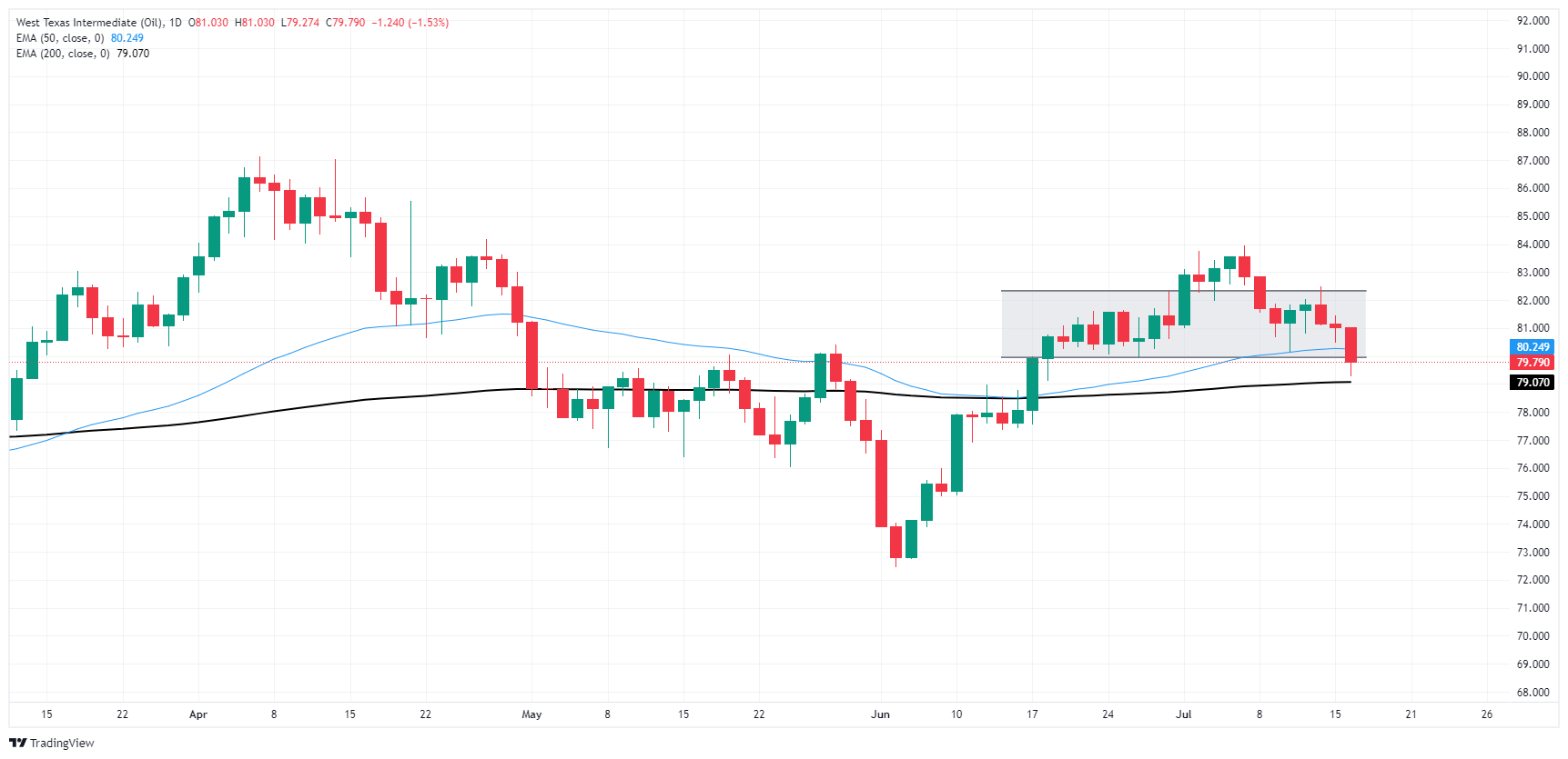 周二WTI油价实现看跌突破,拖累WTI油价进一步跌破位于 81.30 美元的 200 小时指数移动均缐 (EMA),下行势头加速。 7月WTI油价自高点至谷底的跌幅达-5.5%。
