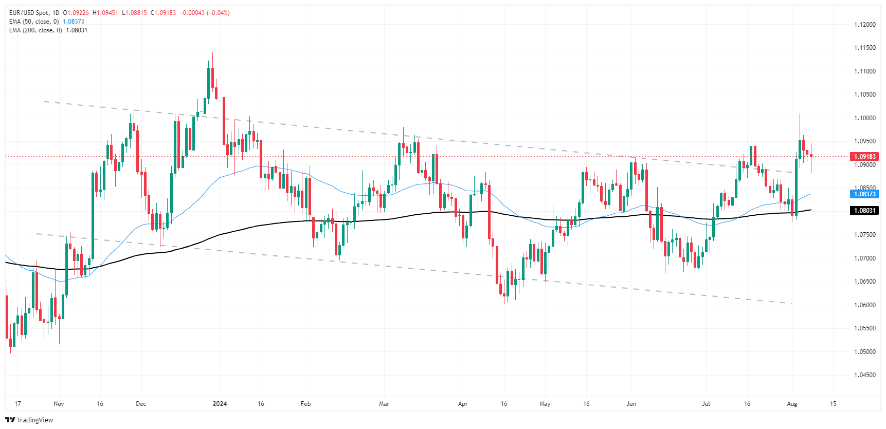 欧元兑美元震盪于 1.0900 附近,交易者踯躅不前