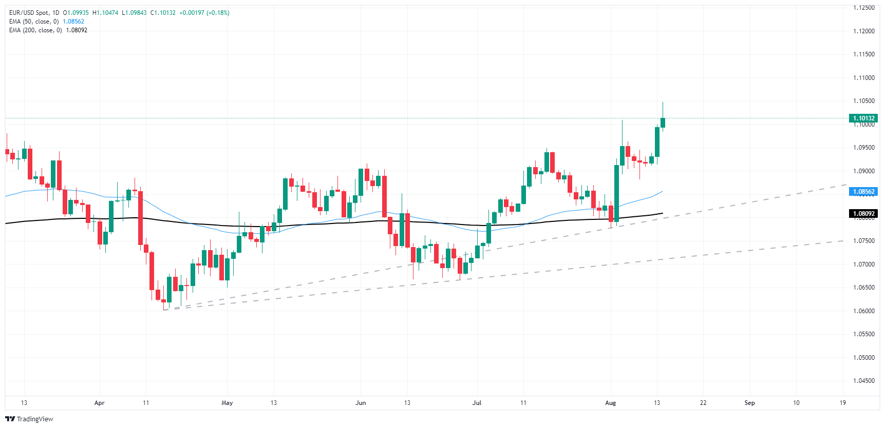 欧元兑美元周三连续第三个交易日上涨,重新站上1.1000关口,并将近期看涨趋势延伸至七个月新高1.1050附近。欧元兑美元的看涨走势有可能耗尽,因為欧元兑美元从 200 日指数移动均缐 (EMA) 1.0829 延续技术性回撤的势头过于迅速。