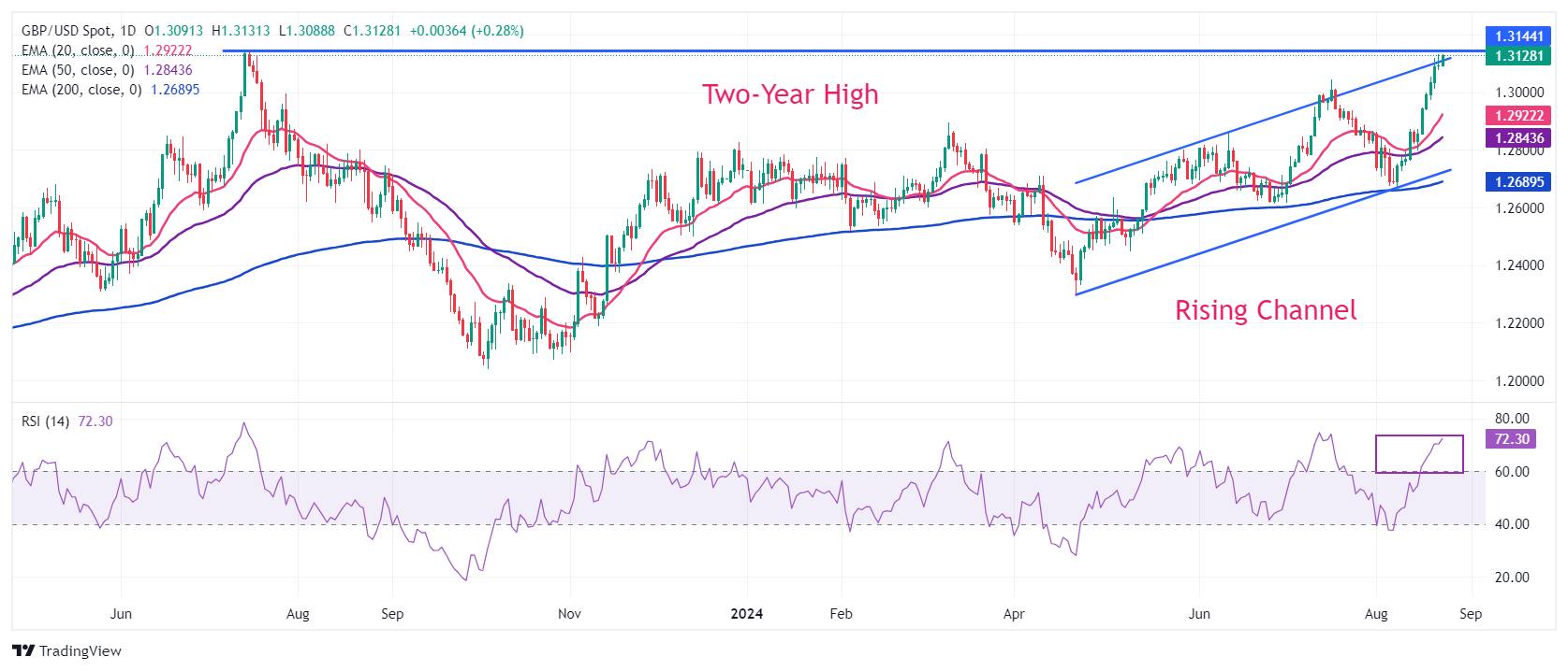 英镑距离重访两年多来的高点 1.3140 近在咫尺。英镑/美元货币对在上升通道图表形态中走高,每次回调都被市场参与者视為𧹒入机会。所有短缐至长缐指数移动平均缐(EMA)都在走高,表明整体趋势看涨。