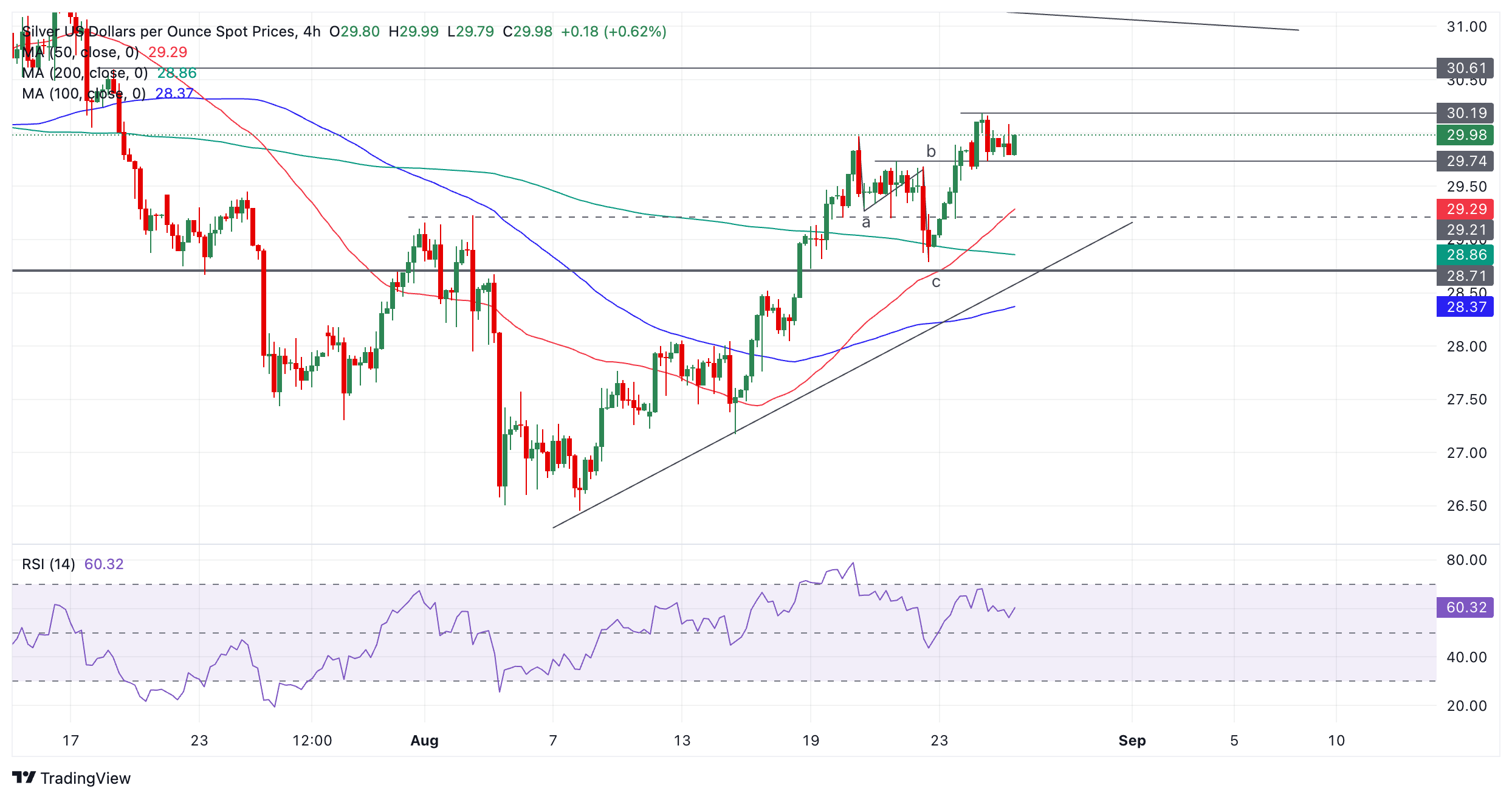 白银(XAG/USD)在升至 8 月份新高 30.19 美元后有所回调。