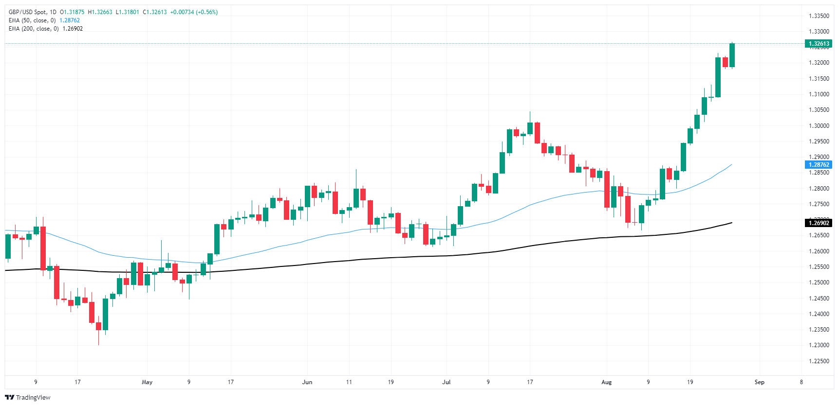 周二,英镑继续搭乘美元全盘下跌的顺风车,英镑兑美元试探多年新高,随后回落至 29 个月高点 1.3266。投资人寄望于联准会(Fed)9月降息,周五将公布美国PCE物价指数,在此之前市场几乎没有重要经济数据可以参考。