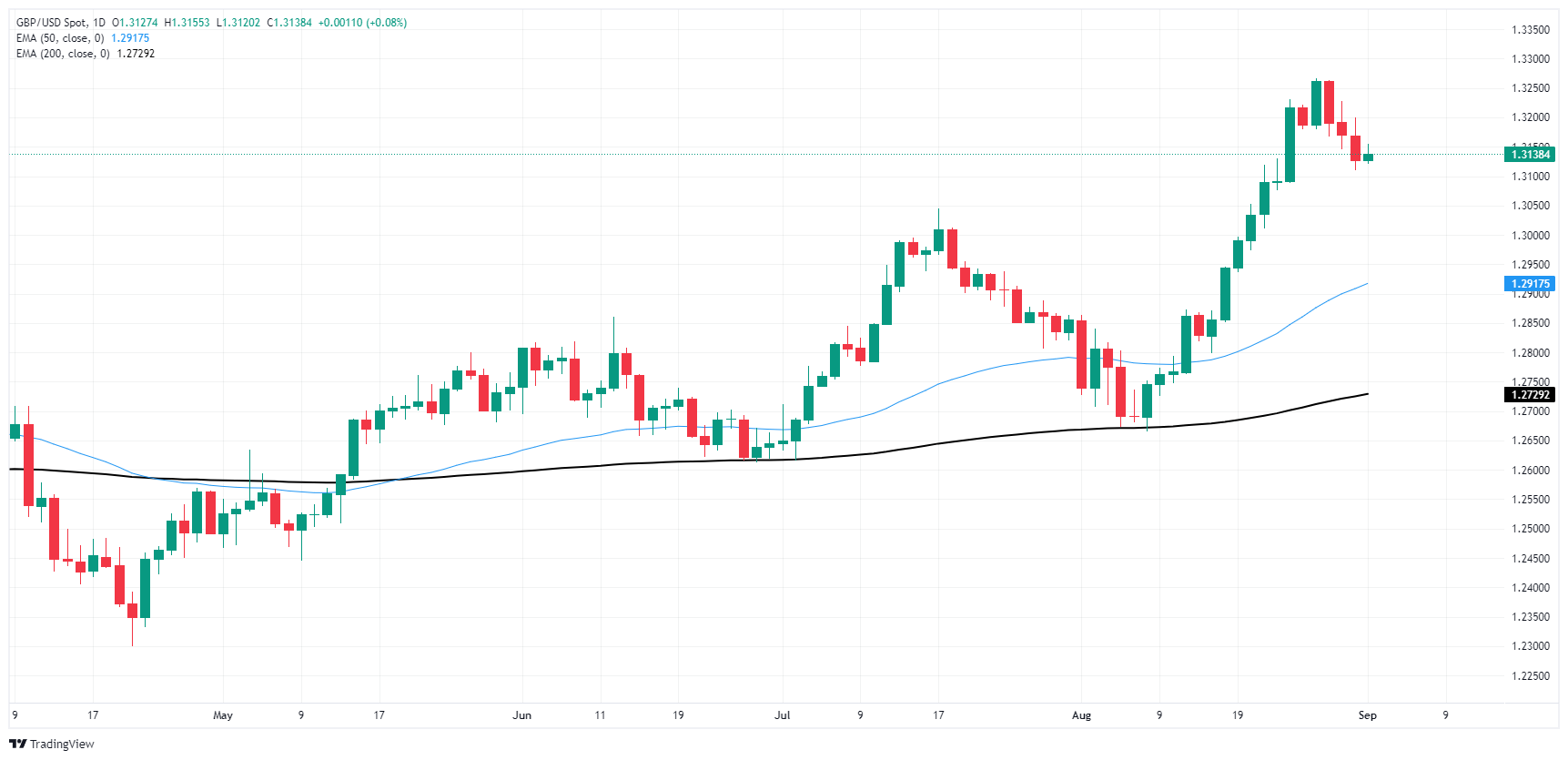 随著美元卖压降温,英镑兑美元从数月高点 1.3250 上方回落至 1.3150 下方,但在 8 月升至 29 个月来的最高点后,英镑兑美元仍坚挺于近期高点附近。物价走势仍坚定地倾向看涨,处在 200 天指数移动均缐 (EMA) 1.2725 上方,而空头的近期下行技术目标将是 50 天指数移动均缐,就在 1.2900 关口上方。