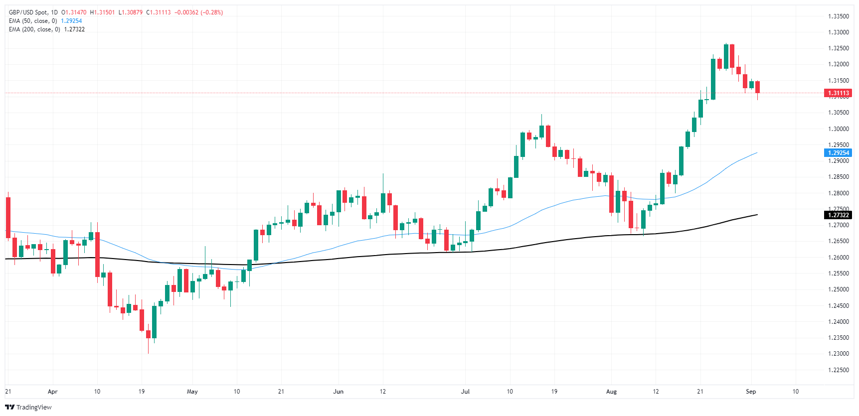 随著美元卖压降温,英镑兑美元从数月高点1.3250 上方回落至1.3150 水平下方,但继8 月上涨至29 个月来的最高点后,英镑/美元仍顽固地维持在近期高点附近。英镑兑美元仍坚定地倾向于看涨,位于 200 天指数移动均缐 (EMA) 1.2725 上方,而空头的直接下行技术目标将是 50 天指数移动均缐所处水平 1.2900 关口紧上方。