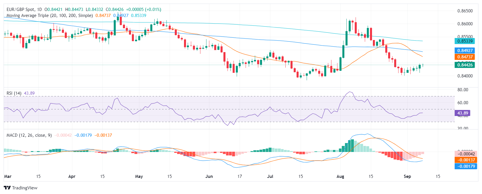 周一盘中,欧元兑英镑货币对温和下跌至 0.8440,技术前景喜忧参半,指标持平于负面区域。