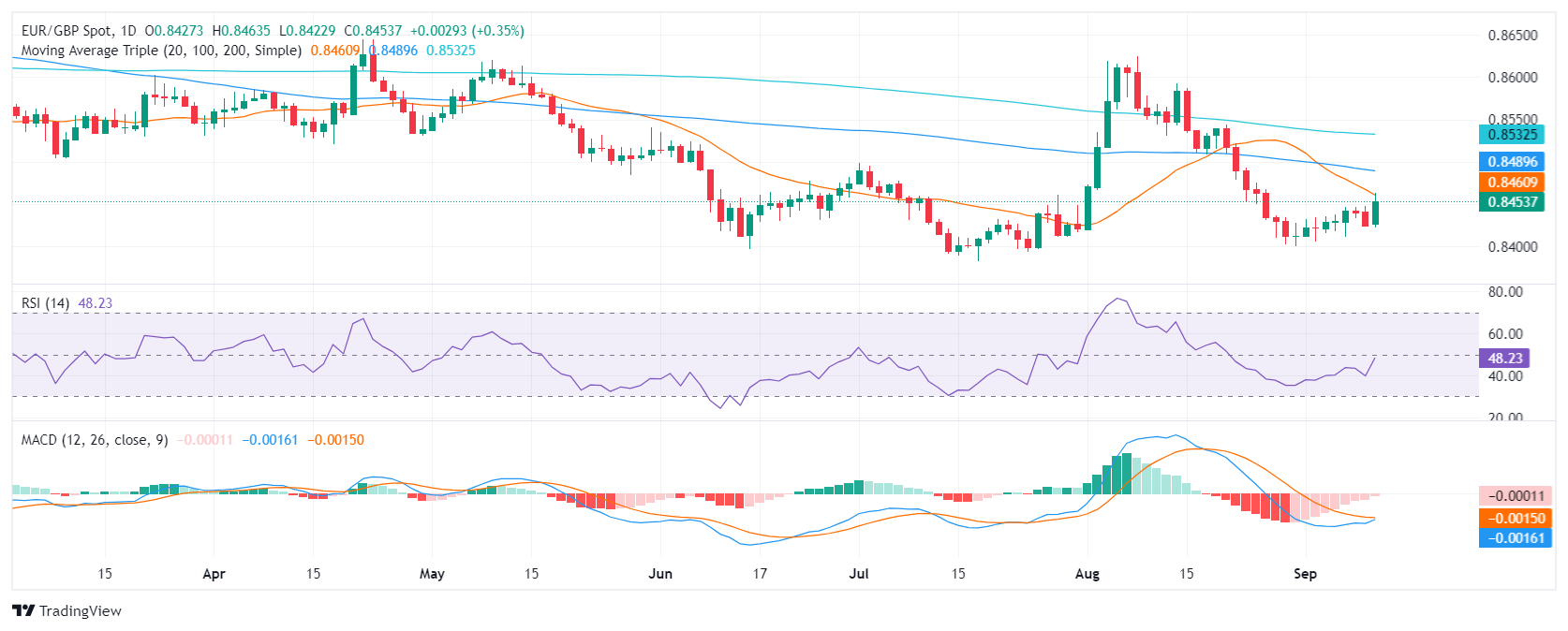 然而,整体前景依然谨慎,因為近期蜡烛图的波动和价格走势表明该货币对将出现盘整。虽然该货币对一直维持在 0.8400 支撑位上方,但下一个阻力位是 20 日简单移动均缐(SMA)0.8460,若突破该阻力位,则可能确认回升。