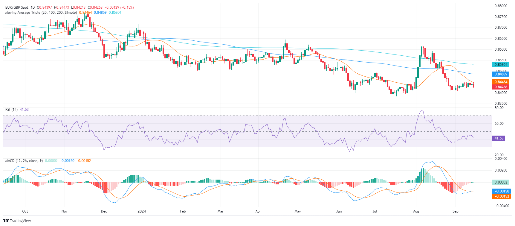 在周一的交易中,欧元/英镑下跌了0.15%,至0.8425。过去几个交易日,该货币对一直在窄幅区间内横盘,没有明显的方向性倾向。然而,最新的价格走势表明,多头在 20 天简单移动平均缐 (SMA) 于0.8445受阻后,卖压正在增加。