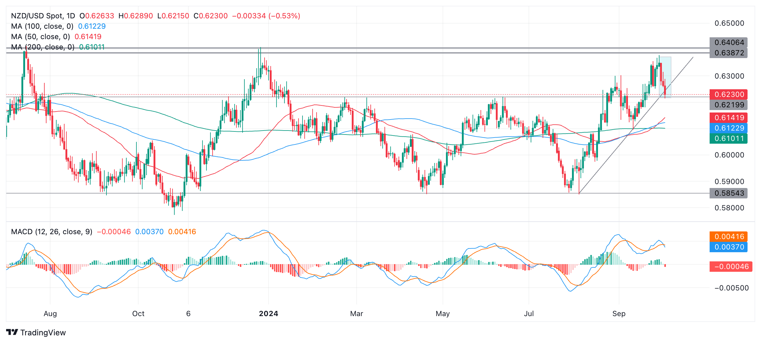 市场有逆转的风险,可能会进一步下行。如果价格收盘大幅低于 0.6220 支撑水平,可能看向 0.6200 或更低的位置。
