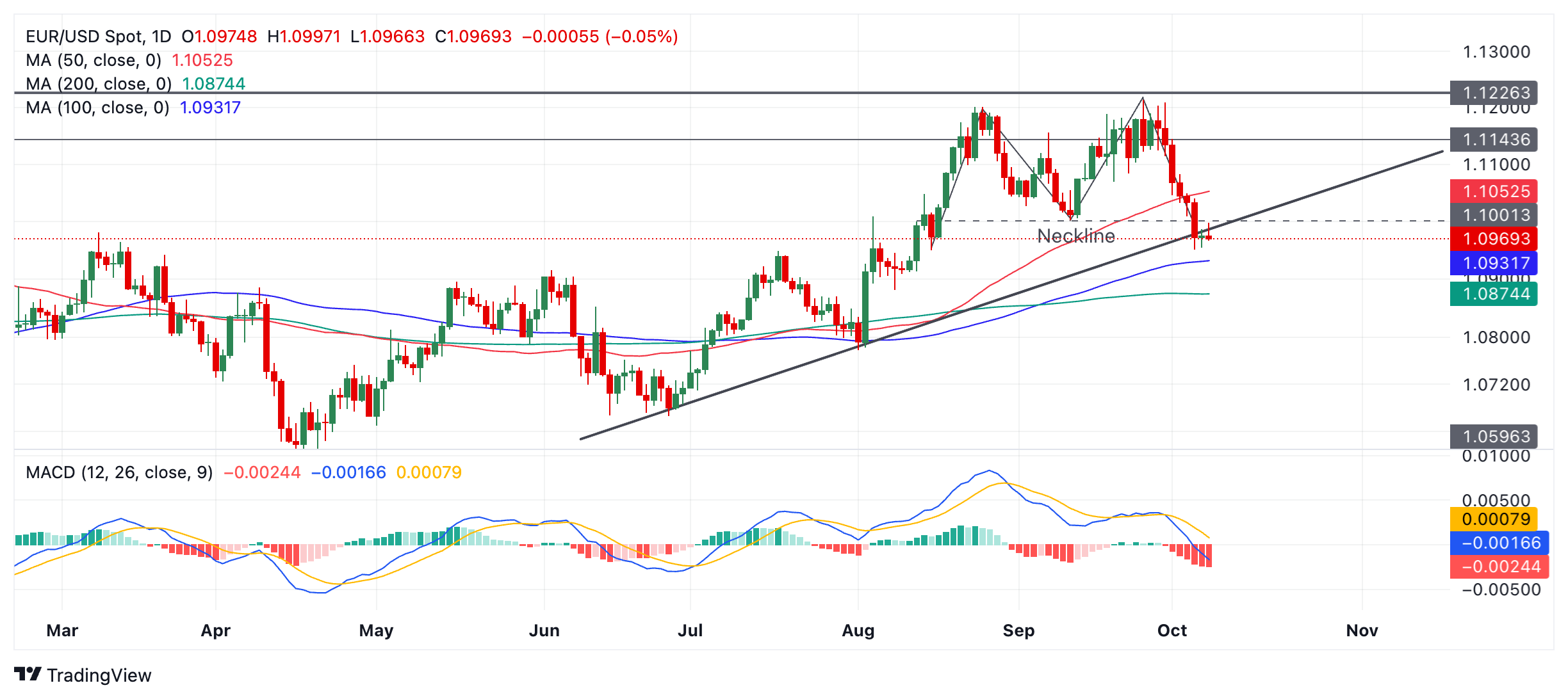图表的整体基调表明短期前景看跌居多。以移动平均缐背离(MACD)衡量的动能处于负值区域。如果价格能收于上周五的低点 1.0951 下方,则突破将得到确认,并可能展𫔭更深的跌势。