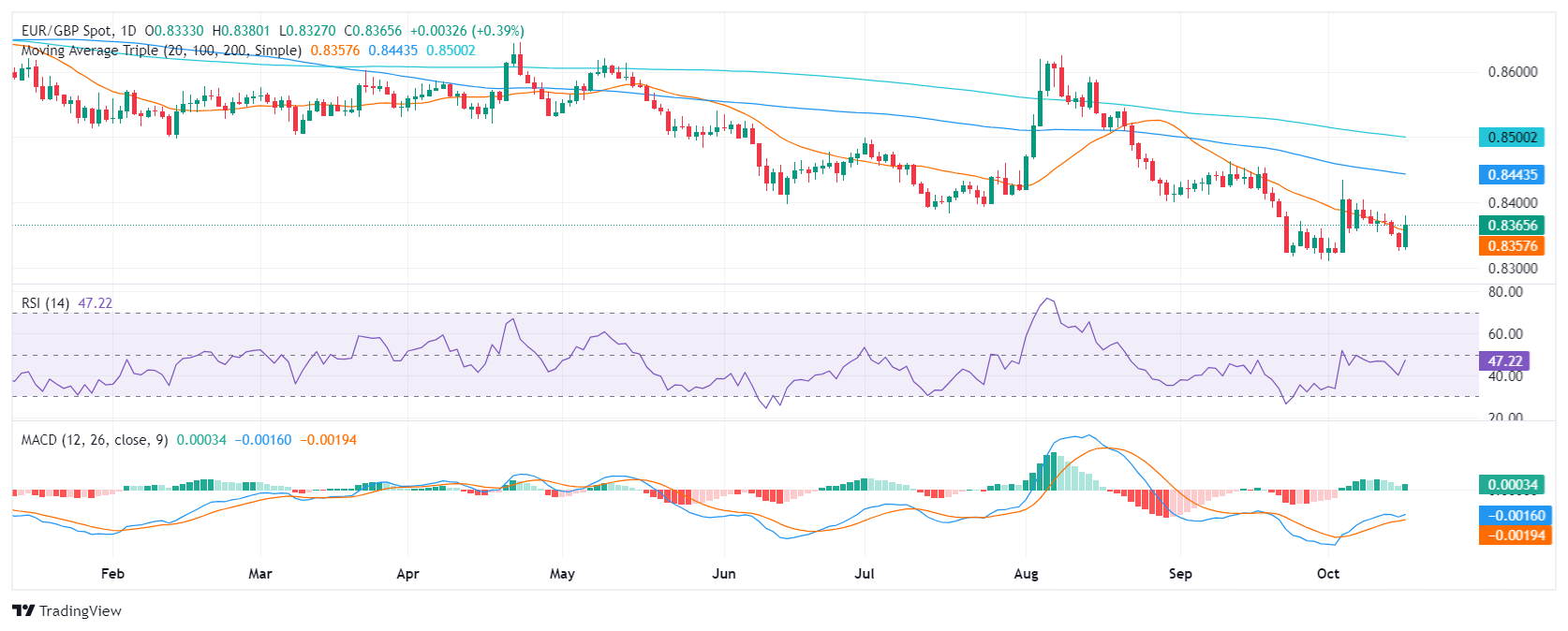 周三盘中,该货币对登陆0.8360,涨幅為0.37%。该货币对飙升并试图穿过 20 日均缐(SMA),但动能仍然平平。
