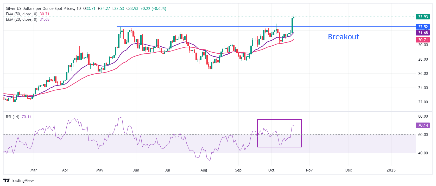 白银价格预测:白银/美元因中东风险偏好和美国大选不确定性而攀升至 34.00 美元上方