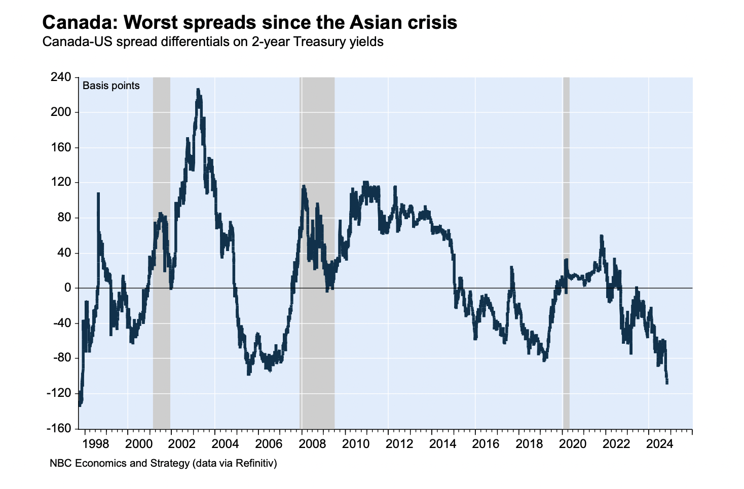 这位策略师说,美国和加拿大政府债券之间的掉期利差--通常被视為汇率的替代指标--已经处于上世纪 90 年代亚洲金融危机以来的低点。