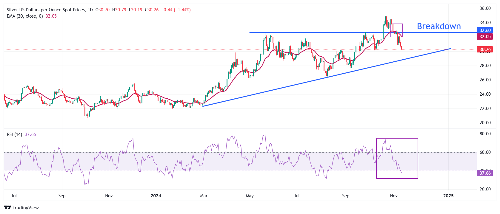 周二欧洲交易时段,白银价格(XAG/USD)进一步下跌至 30.20 美元附近。由于市场预期当选总统唐纳德-特朗普(Donald Trump)的政策将助推美国(US)经济增长和通胀压力,美元(USD)走强,白色金属走软。
