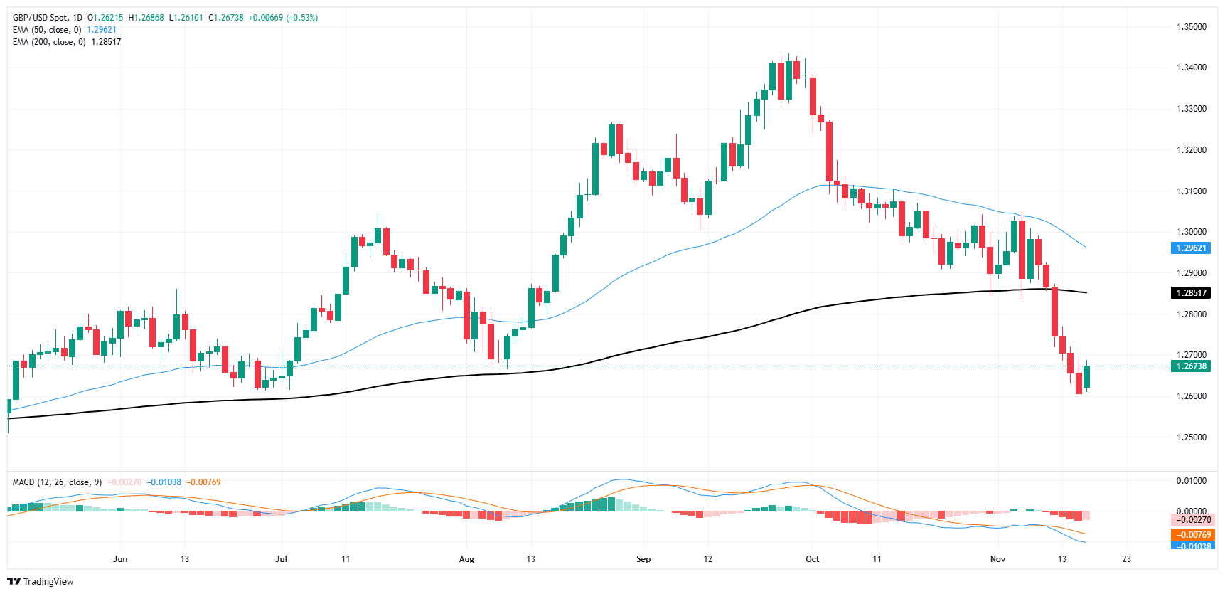 英镑周一收盘略下跌 0.5%,但累计跌幅仍令英镑深陷 1.2850 附近的 200 日指数移动均缐(EMA)下方看跌区域。