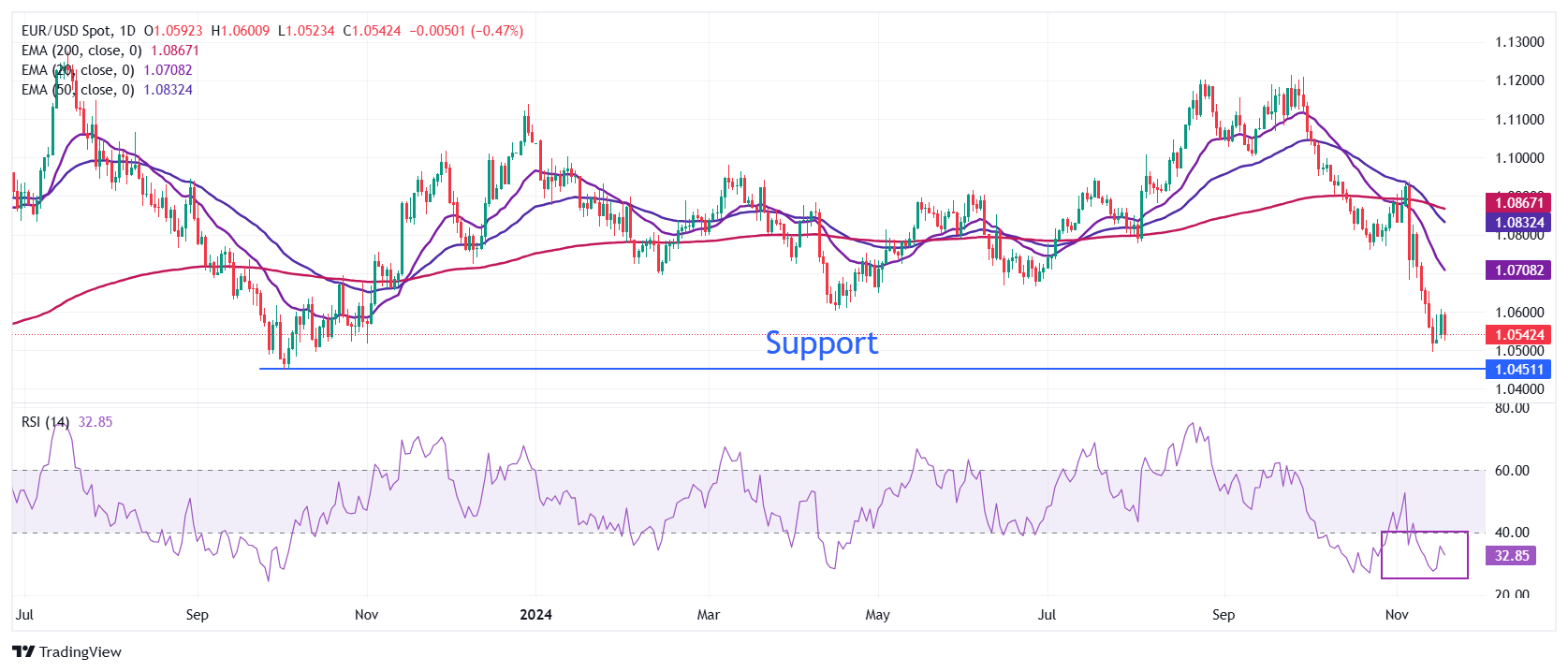 - 欧元/美元上周成功在1.0500附近获得一些需求,因美元(USD)在创下年内新高后面临小幅修正,美元指数(DXY)从107.00回落。由于市场参与者认為特朗普的政策将促使通货膨胀和经济增长的预期使美元有更大的上涨空间,因此该主要货币对的前景依然看淡。