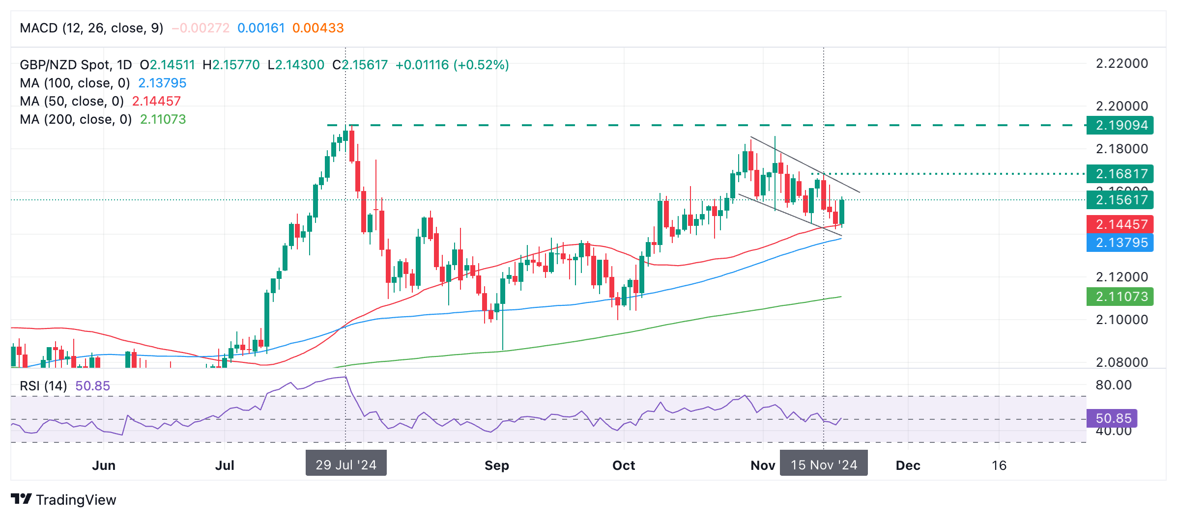 英镑/纽元在 10 月 30 日的高点触顶后,11 月份一直在一个小型通道中修正。目前已触及 50 日均缐(SMA)2.1446 的支撑位,并在周三强劲反弹,迄今為止的绿色长蜡烛图就是证明。