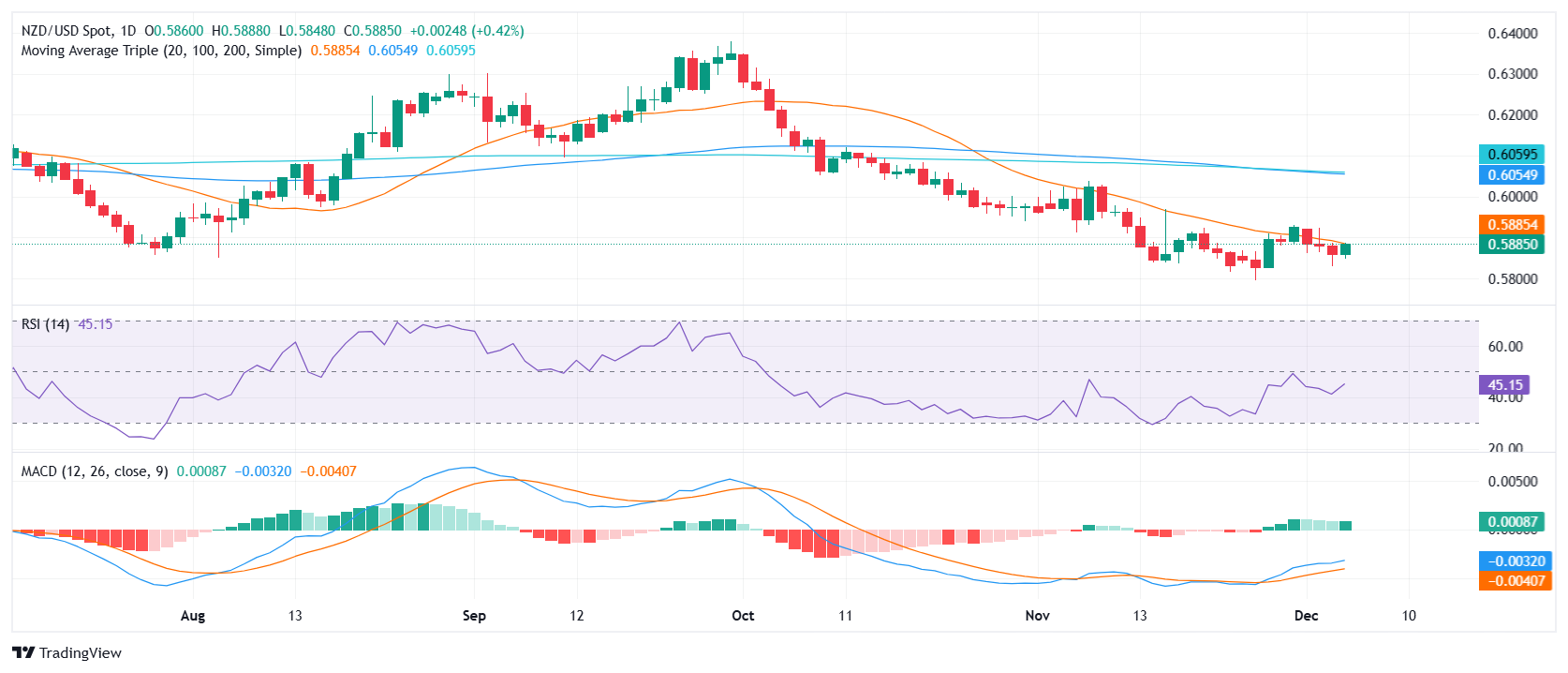 周四,纽元/美元震盪走高,涨幅為0.15%,交投于0.5890附近。侭管出现了这种上行走势,但继续在 20 日均缐(SMA)处面临强大阻力,未突破该水平,总体前景继续倾向于下跌。