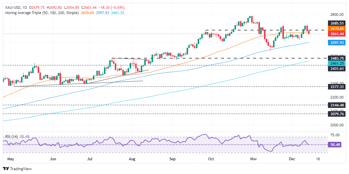 黄金价格在触及两个月高点2,726美元后继续回调,滑向2,650美元区域。黄金似乎在2,600-2,700美元区间内找到了其公允价值,接近50日和100日简单移动平均缐(SMA),分别為2,670美元和2,597美元。