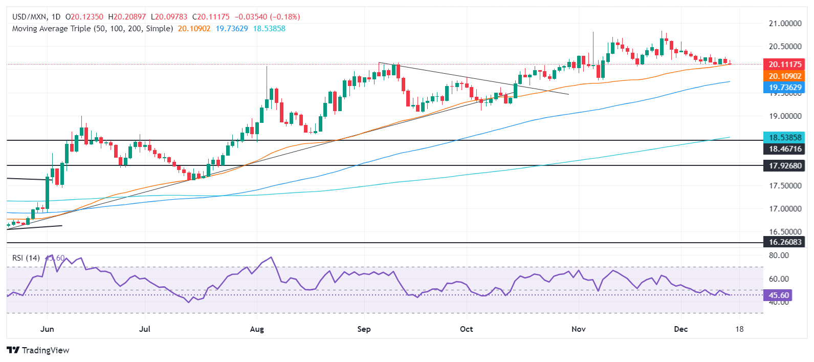 墨西哥比索本周初表现不佳,但仍接近20.11的50日简单移动平均缐(SMA),因為美国服务业活动扩张,而製造业仍然低迷。截至发稿时,美元/墨西哥比索交易微涨超过0.06%,几乎没有变化。