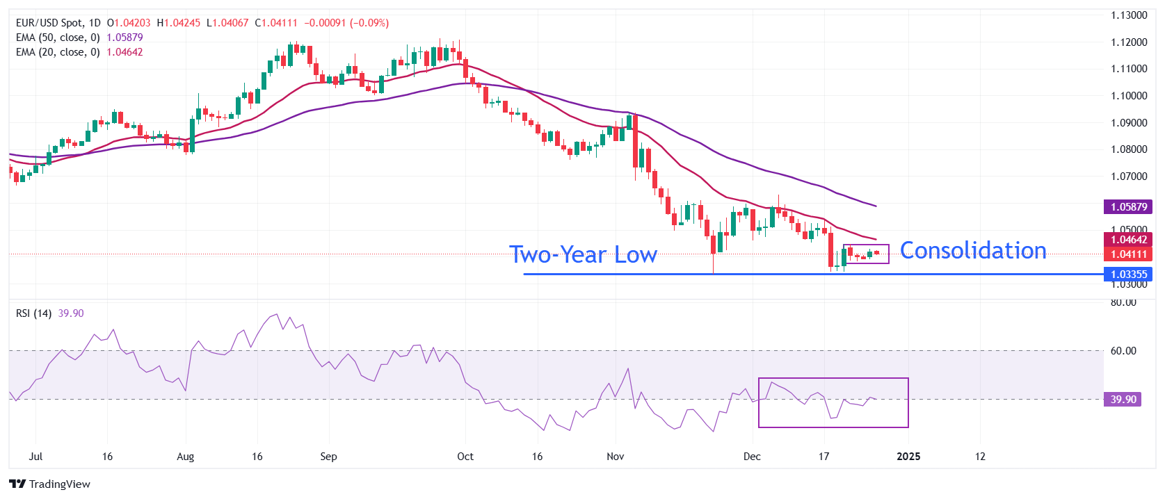 周五欧洲时段,欧元/美元在1.0400附近窄幅交易,市场参与者因圣诞假期保持观望,交易清淡。该货币对努力寻找方向,而美元(USD)则在美联储(Fed)将遵循逐步放宽政策的坚定预期下走高,因為通货膨胀在过去三个月中略有反弹。