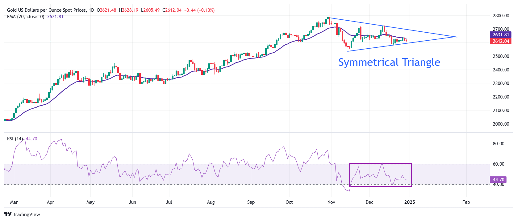 黄金价格在日图时间框架上以对称三角形图表形态交易,表现出急剧的波动收缩。2,630 美元附近的 20 日指数移动均缐 (EMA) 与黄金价格重叠,暗示横盘波动趋势。