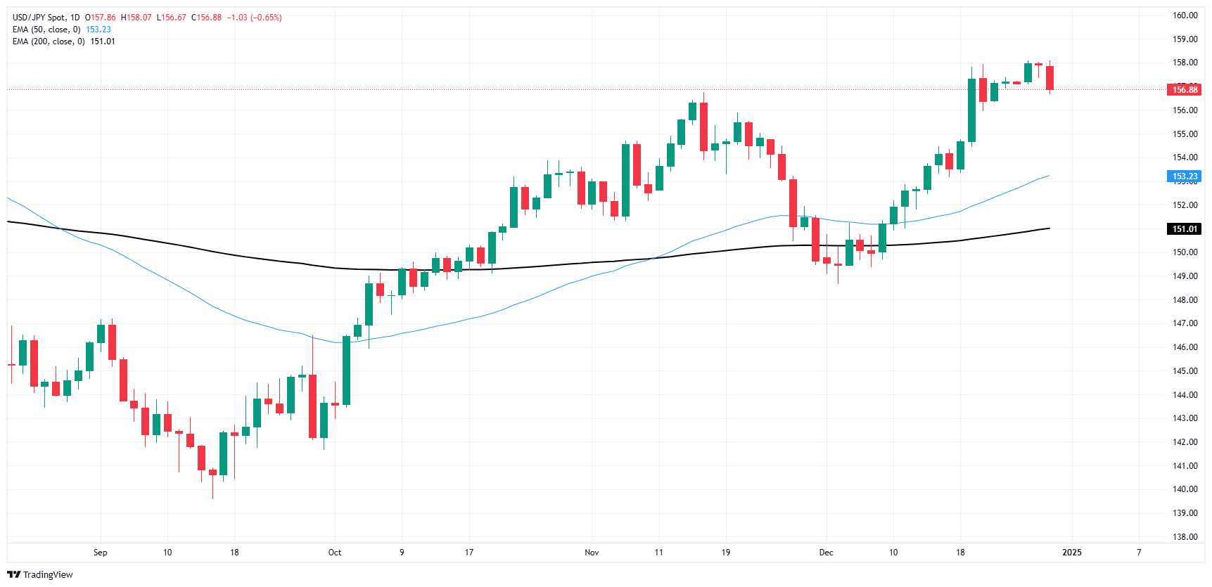 尽管周一出现看跌阳线,但美元/日元仍维持走强,继短暂冲入 158.00 关口后试探 157.00 附近。美元/日元从 150.00 附近的 200 日指数移动均线 (EMA) 反弹,在此过程中自底部到高位上涨了 6.35%。