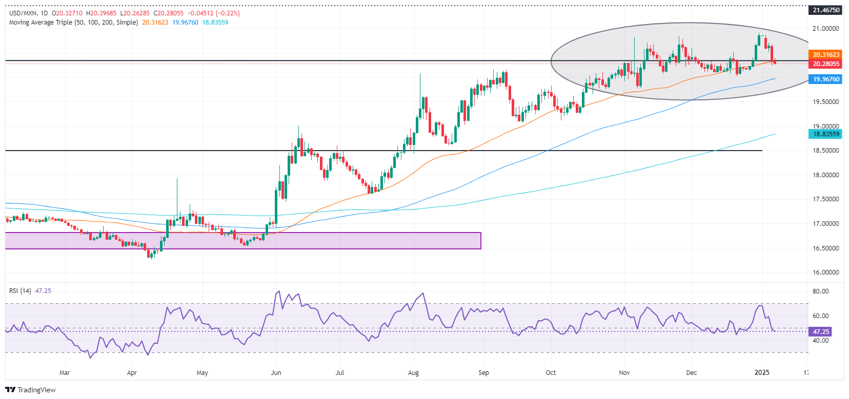 因此,如果美元/墨西哥比索跌破50日SMA,下一个支撑位将是20.00。若跌破该水平,将暴露100日SMA 19.91,随后是19.50。
