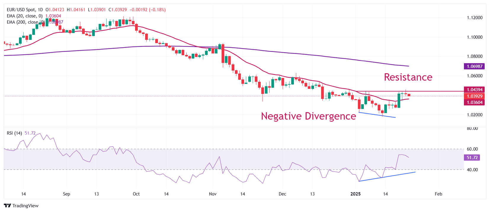 欧元/美元难以延续从1月13日创下的两年低点1.0175𫔭始的反弹,未能突破1.0460的即时阻力位。主要货币对在动量和价格行动的背离后反弹。14天相对强弱指数(RSI)形成了更高的低点,而货币对则创下了更低的低点。