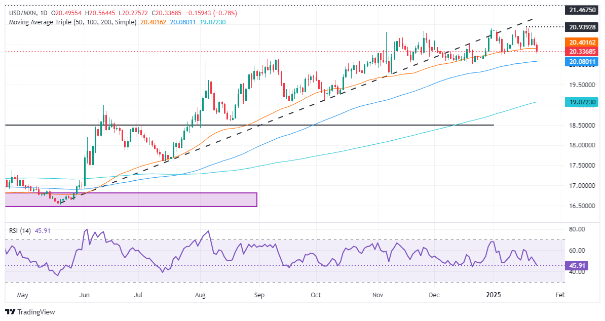 USD/MXN跌破20.50,因特朗普对墨西哥的友好言论推动汇率跌破关键支撑位,如20和50日简单移动平均缐(SMA),分别為20.55和20.37
