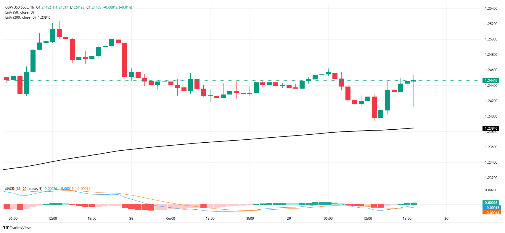周三,英镑/美元波动,跌破1.2420后回升至1.2450,因為多头和空头的持续争斗导致日内波动性不大。美联储(Fed)如期维持利率不变,利率期货市场预期一致,美联储主席杰罗姆·鲍威尔强调了他们基于数据的利率调整策略。