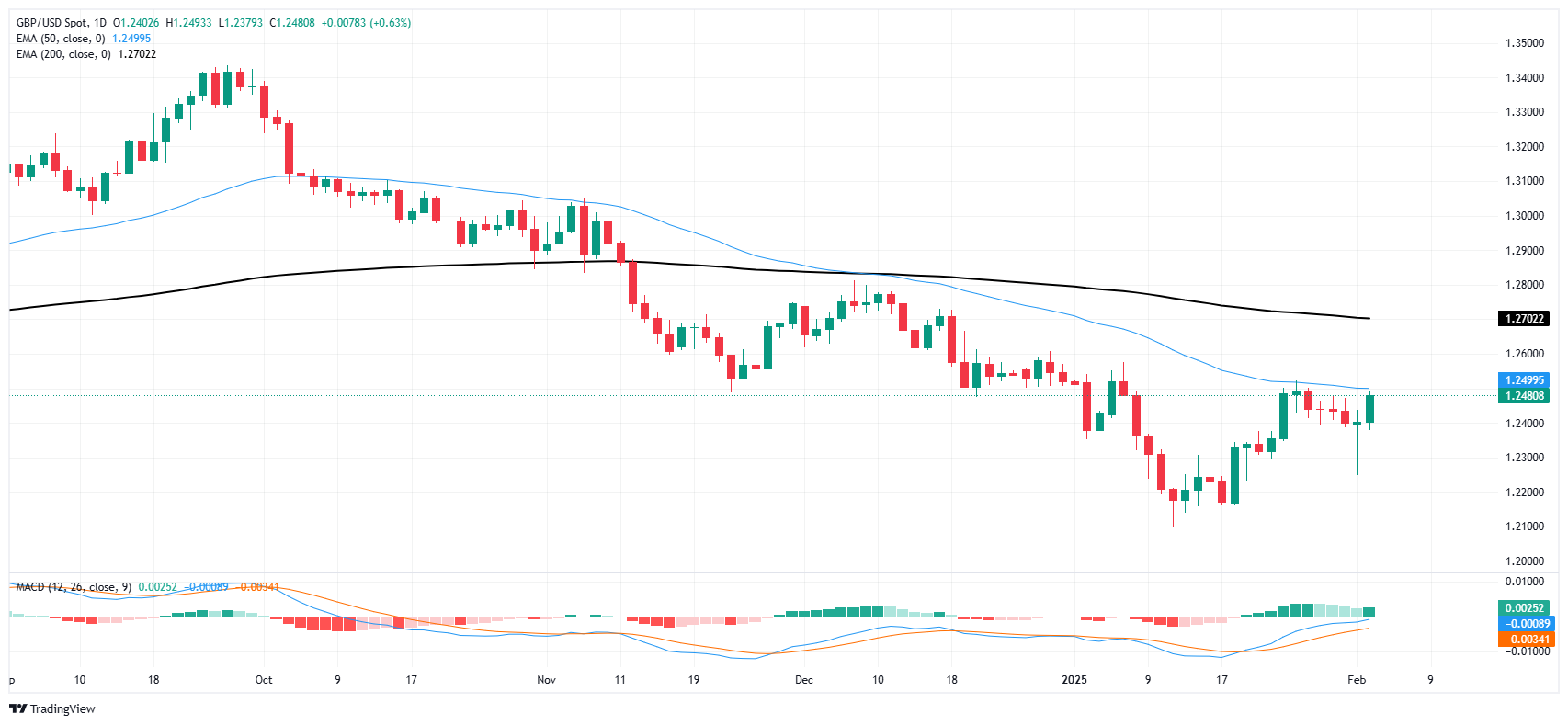 英镑/美元上涨了略高于0.6%,回升至1.2480,但该货币对仍受制于1.2500关口下方,因為50日指数移动均缐(EMA)对短期价格走势产生了压力。