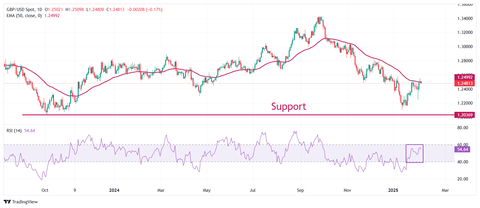英镑兑美元的上涨在突破1.2500的心理关口后暂停,该区域也与50日指数移动平均缐(EMA)波动的区域重合。