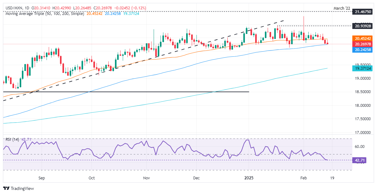 - 美元/墨西哥比索跌破20.42的50日简单移动均缐(SMA),交易于20.27。