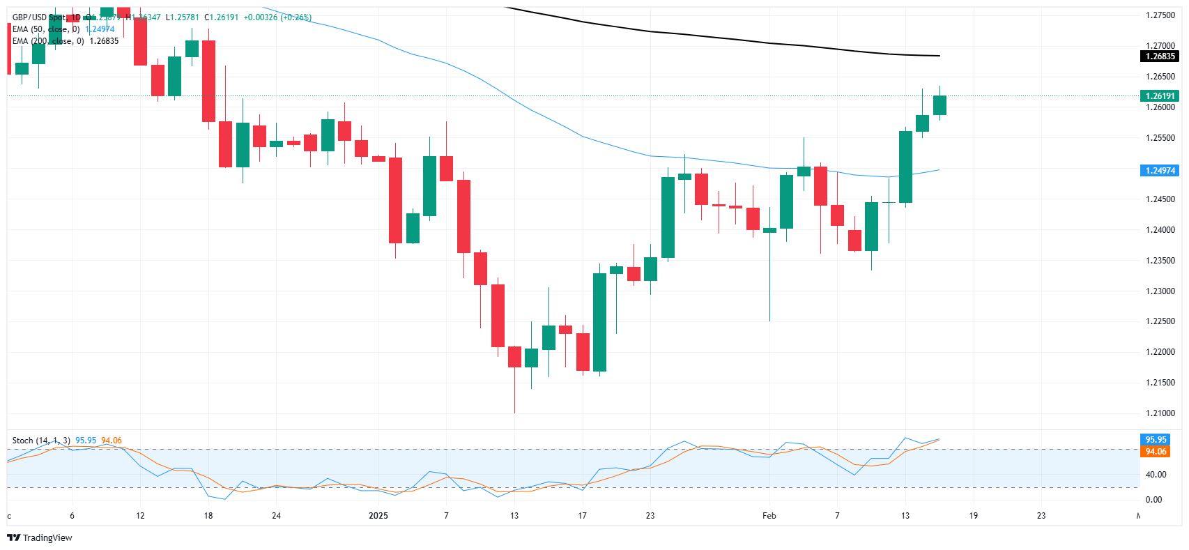英镑/美元周一再度录得日内涨幅,首次在12月中旬后收于1.2600关口上方。该货币对稳步攀升,但价格走势仍受限于200日指数移动均缐(EMA)1.2660附近下方。