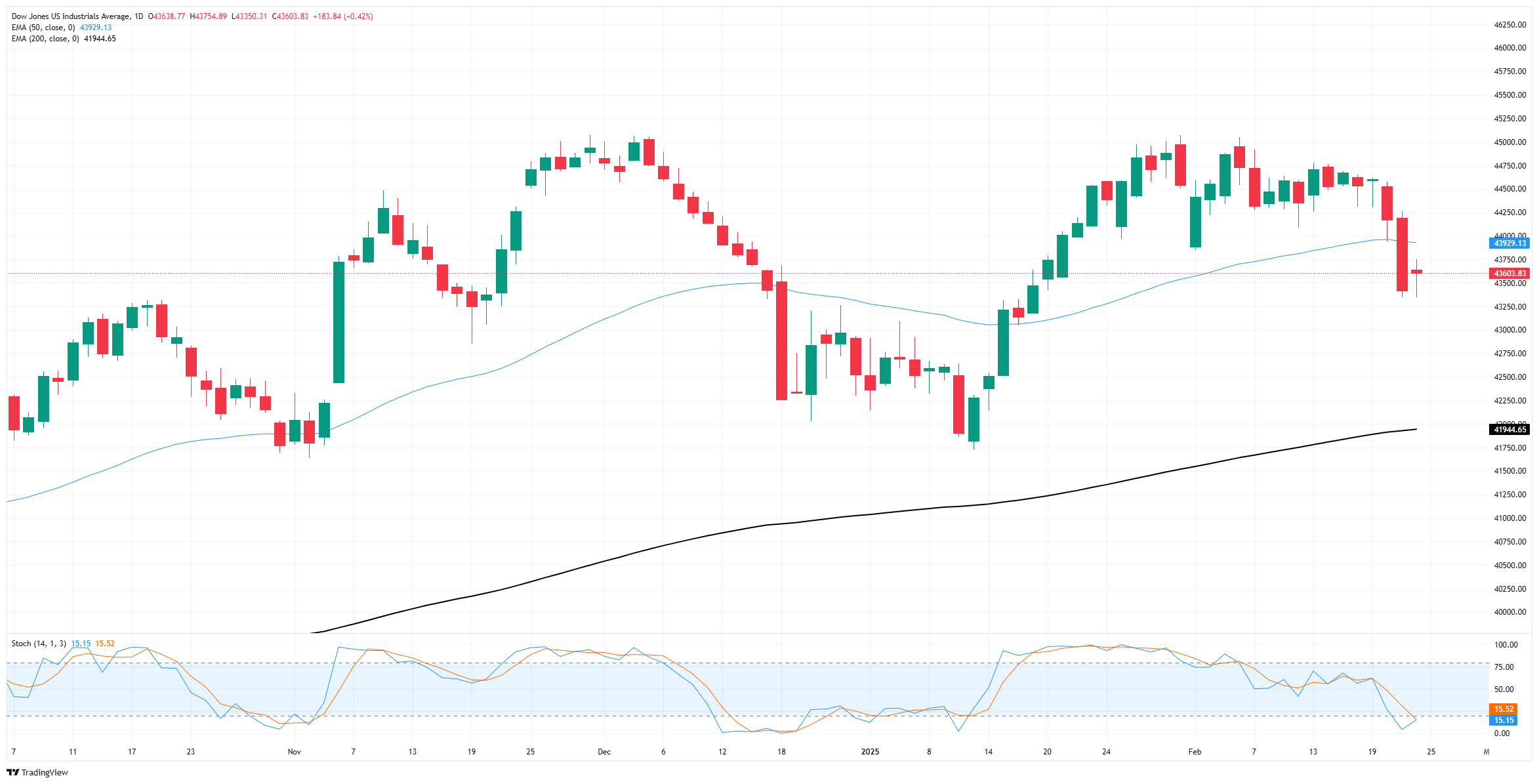道琼斯在為期两天的下跌中下跌了约2.75%,从44,575跌至43,345,但随著市场从四周低点反弹,进一步的下行损失似乎不太可能。价格走势仍然在接近42,000的长期200日EMA上方得到良好支撑。