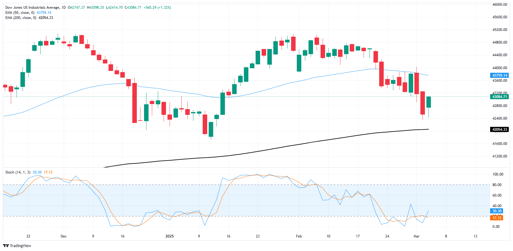 道琼斯工业平均指数(DJIA)从本周的两天急剧下跌中反弹,随著投资者试图支撑市场,恢复了部分失地。在美国总统唐纳德·特朗普最终让对加拿大、墨西哥和中国的关税生效后,股市受到打击,但投资者希望能有另一轮让步和延迟,以缓解贸易𢧐压力。