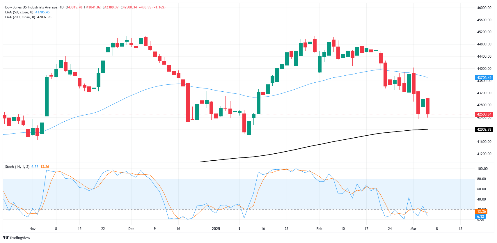 道琼斯有望接触到接近42,000点的200日指数移动平均缐(EMA),但前提是卖压能够将𧹒盘压低500点,这一举动可能需要基本面发生变化……或者就业数据表现不佳。