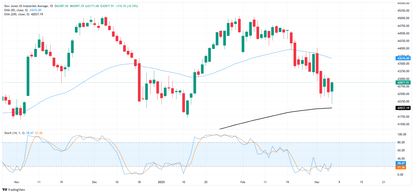道琼斯工业平均指数(DJIA)在周五表现挣扎,跌至42,200以下的新七周低点,随后轻微回升至42,800区域。道琼斯本周仍大幅下跌,自周一𫔭盘以来下跌了2.6%,因贸易𢧐担忧影响投资者情绪,以及中等的数据印刷暗示美国经济前景出现裂痕。
