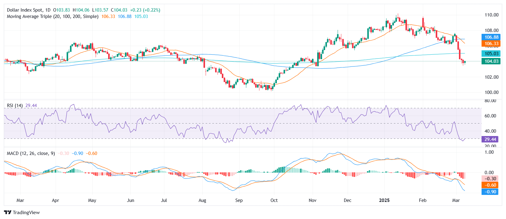 美元指数(DXY)在104.00以下稳定,经过上周的急剧下跌后进行整合。20日和100日简单移动平均缐(SMA)在107.00附近确认了看跌交叉,强化了负面趋势。相对强弱指数(RSI)仍接近超卖区域,暗示短期反弹的潜力。与此同时,移动平均趋同/背离(MACD)保持看跌,暗示除非𧹒家在支撑位附近介入,否则可能面临进一步下行风险。如果DXY未能重新夺回104.50,下一支撑位预计在103.30附近,这可能决定是否会出现更深的下跌。
