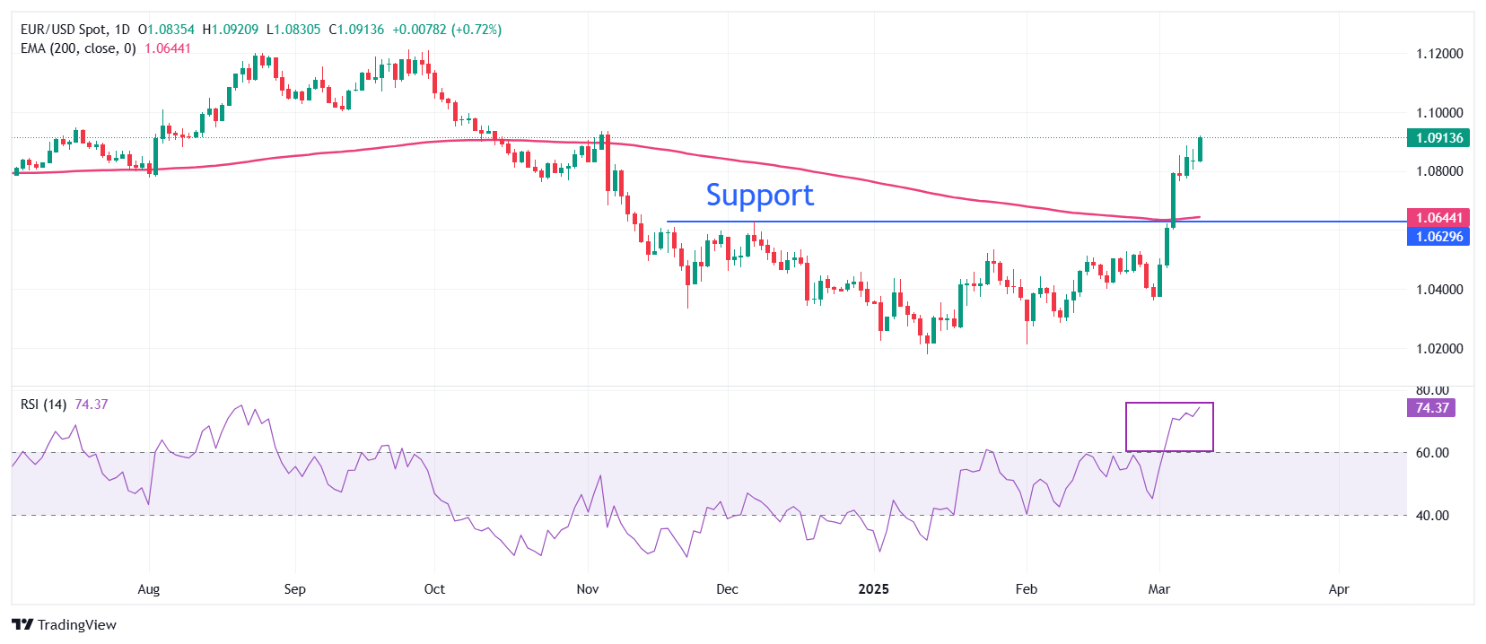 - 共享货币在过去近两周表现强劲,因為通过扩大"债务刹车"来增加德国的支出能力将刺激经济,而该经济在过去两年中遭受了破坏和收缩。