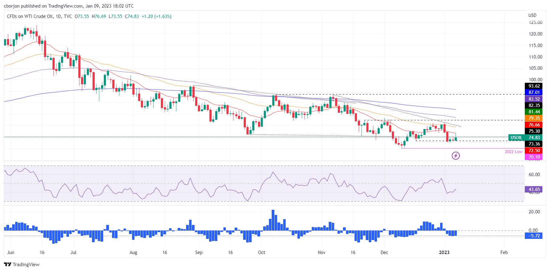 继中国𫔭放边境后,WTI油价攀升后持稳于74.80美元附近