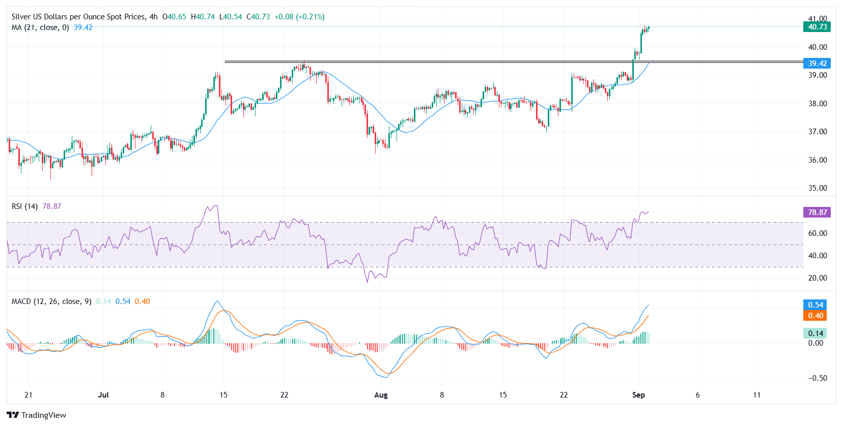 白银(XAG/USD)以强劲的姿态𫔭啟新的一周,现货价格连续第五个交易日延续反弹,突破$40.00大关,触及14年新高——这是自2011年9月以来的最高水平。在撰写本文时,该金属在$40.70附近盘整,由于美国劳动节假期,交易条件较為清淡。